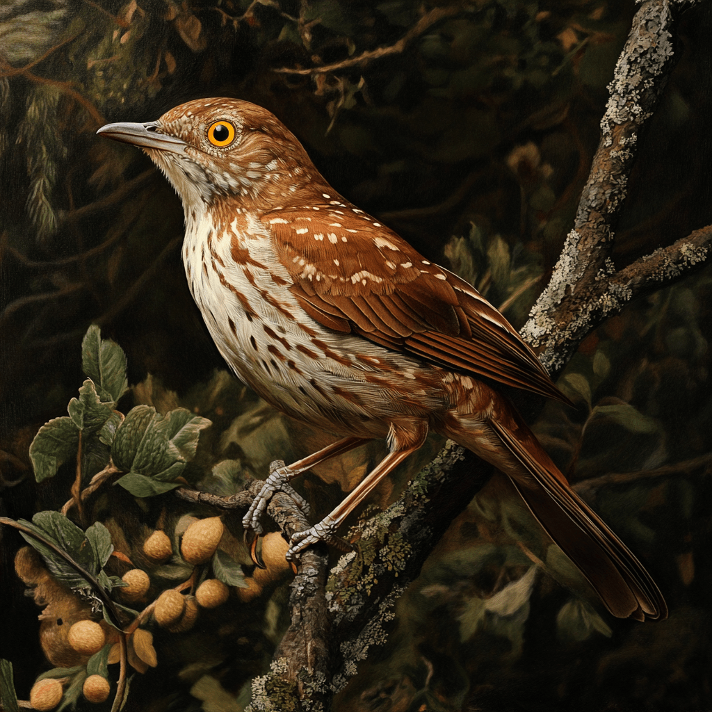 Brown Thrasher: The Brown Thrasher is a sizable songbird with reddish-brown feathers, and bright yellow eyes. Renowned for its remarkable vocal abilities, this bird can imitate a wide variety of sounds. Often found foraging in leaf litter or dense thickets, Brown Thrashers are somewhat secretive but become quite vocal when defending their territory.